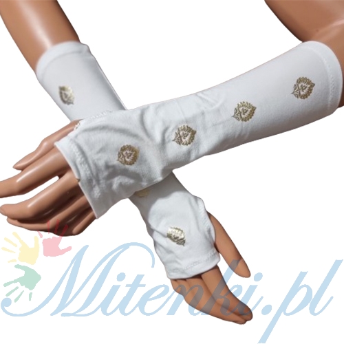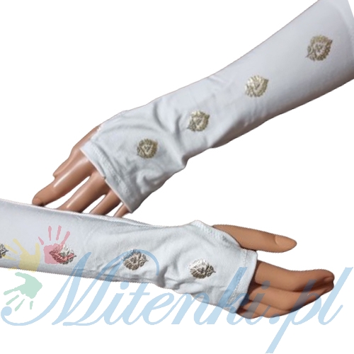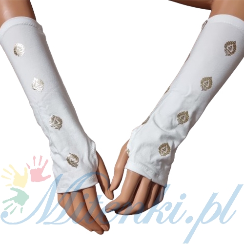 Białe mitenki zakładane na kciuk ze złotym listkiem 25 cm.