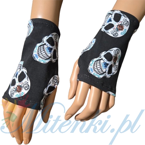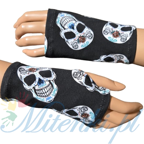 Strona główna » MITENKI NA KCIUK » Czarne gotyckie mitenki na kciuk bawełniana dzianina w czaszki 13 cm