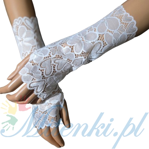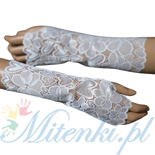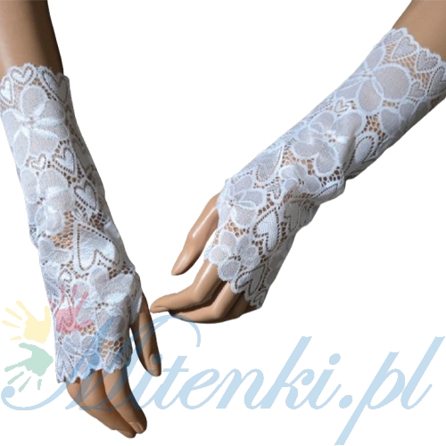 Mitenki zakładane na kciuk wykonane z wysokogatunkowej elastycznej białej koronki z lycrą.