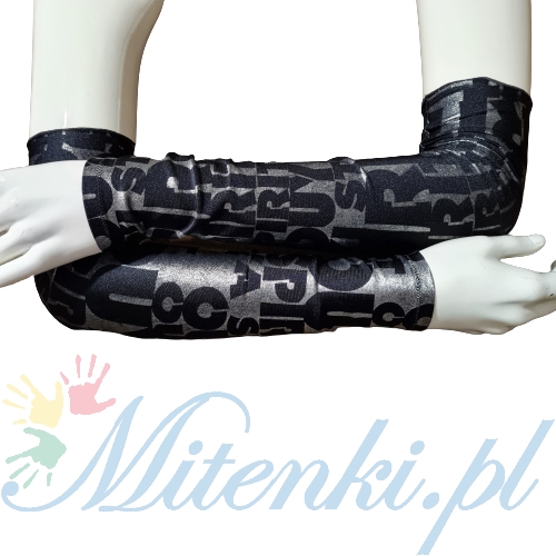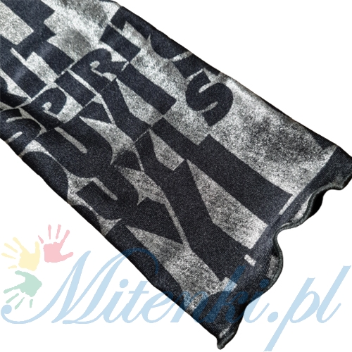 Wykonane z elastycznej błyszczącej dzianiny z czarnymi napisami, wykończone ozdobnym ściegiem.